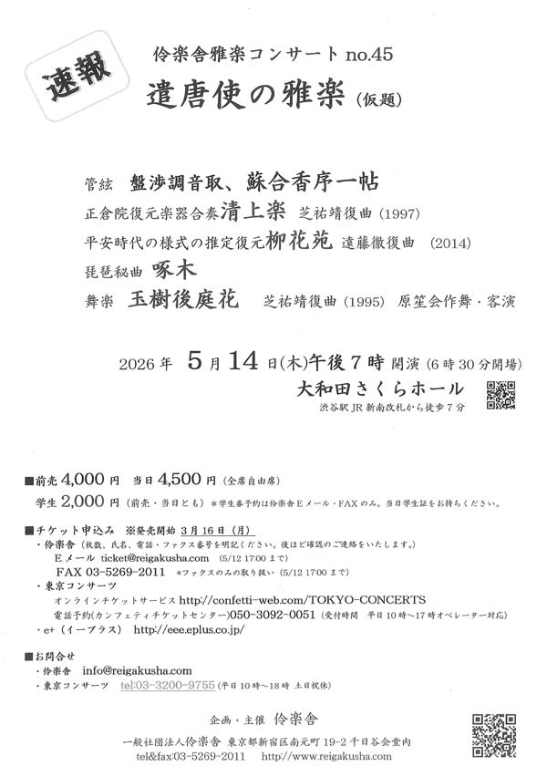 伶楽舎雅楽コンサートno.45 遣唐使の雅楽(仮題)