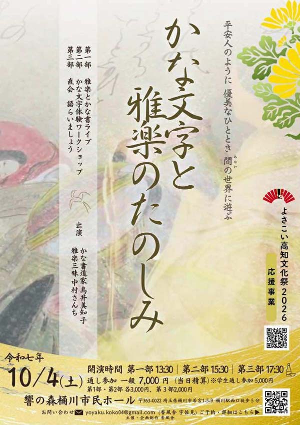 料金:第一部・雅楽演奏会 3,000円/第二部・かな文字ワークショップ 3,000円/第三部・2,000円/通し参加6,000円