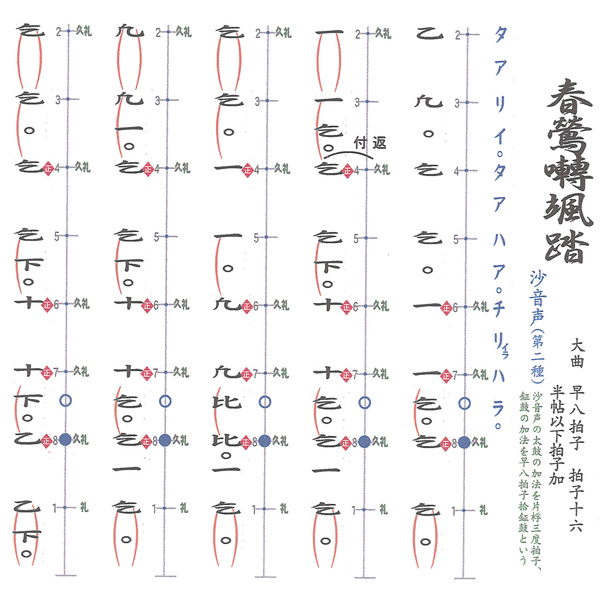 ・音取・春鶯囀颯踏・春鶯囀入破・賀殿急・武徳楽・北庭楽・蘭陵王・迦陵頻急・酒胡子・胡飲酒破・新羅陵王急・